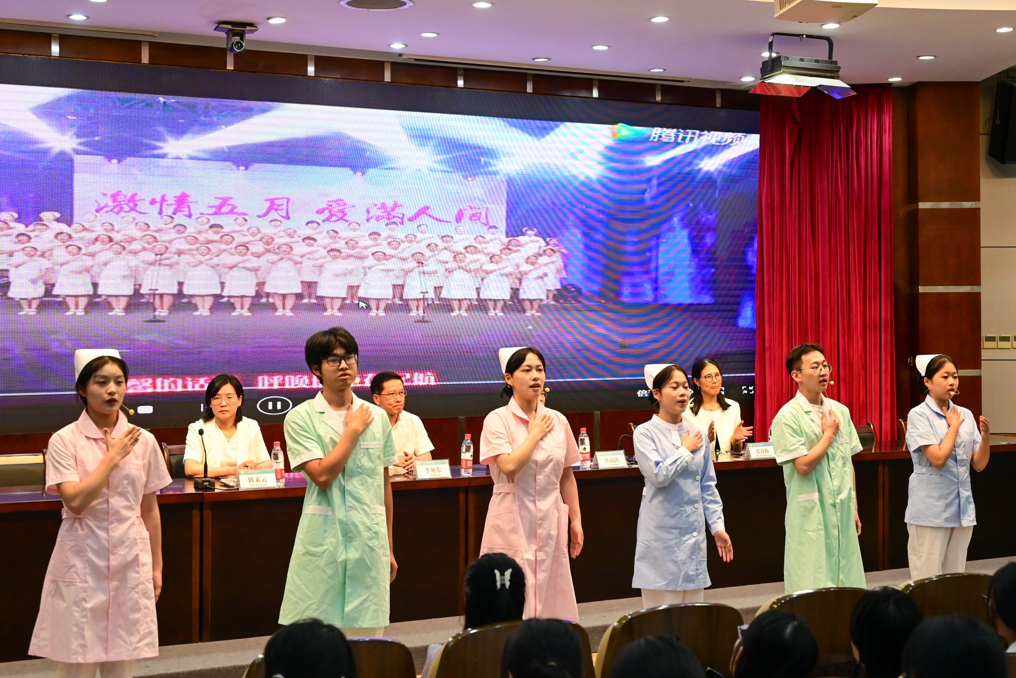 “中国护士,大爱无疆,用奉献浇灌生命,让生命永远绽放……”学院全体师生唱响《中国护士之歌》,唱出心中理想,激励自己向着光辉的目标齐头并进。现场那一身身洁白无瑕的护士服,一双双坚毅清澈的眼睛仿佛在昭示护理学子的美好未来。希望2023级全体同学能传承弘扬南丁格尔精神,不忘救死扶伤的初心和使命,踏实耕耘,为祖国医药卫生健康事业贡献出一份自己的力量。