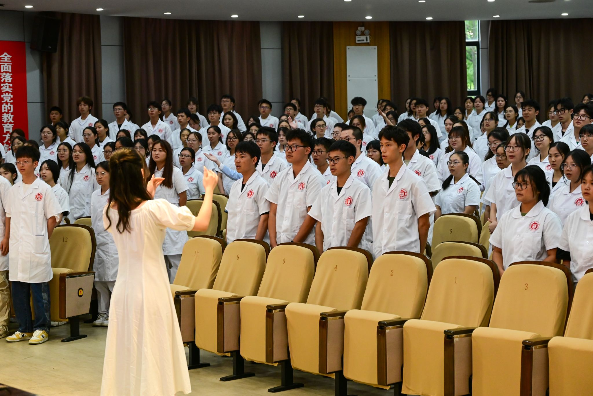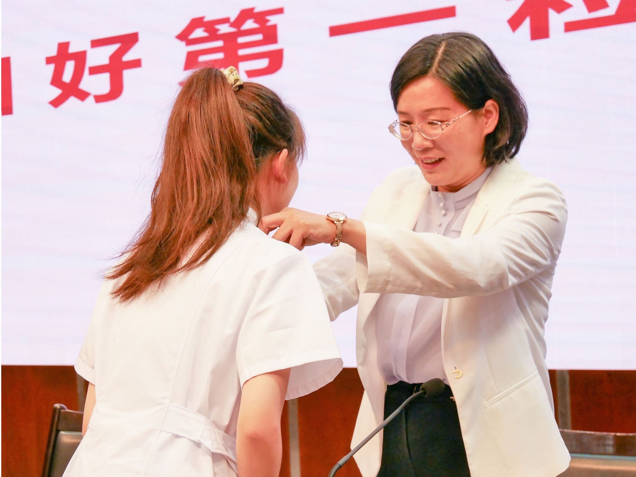 开学典礼上还设计了“扣好第一颗扣子”入学仪式,老师们为第一次穿上白大褂的新生代表们扣上第一颗扣子。这一仪式不仅包含着老师们对同学们的期望和祝福,也意味着同学们的责任和理想。这是“人生第一扣”,也是极为重要的一扣。愿同学们在未来的学习和工作之路都能记得这枚扣子,同时树立正确的价值取向和崇高的职业理想,怀救苦之心,做苍生大医。