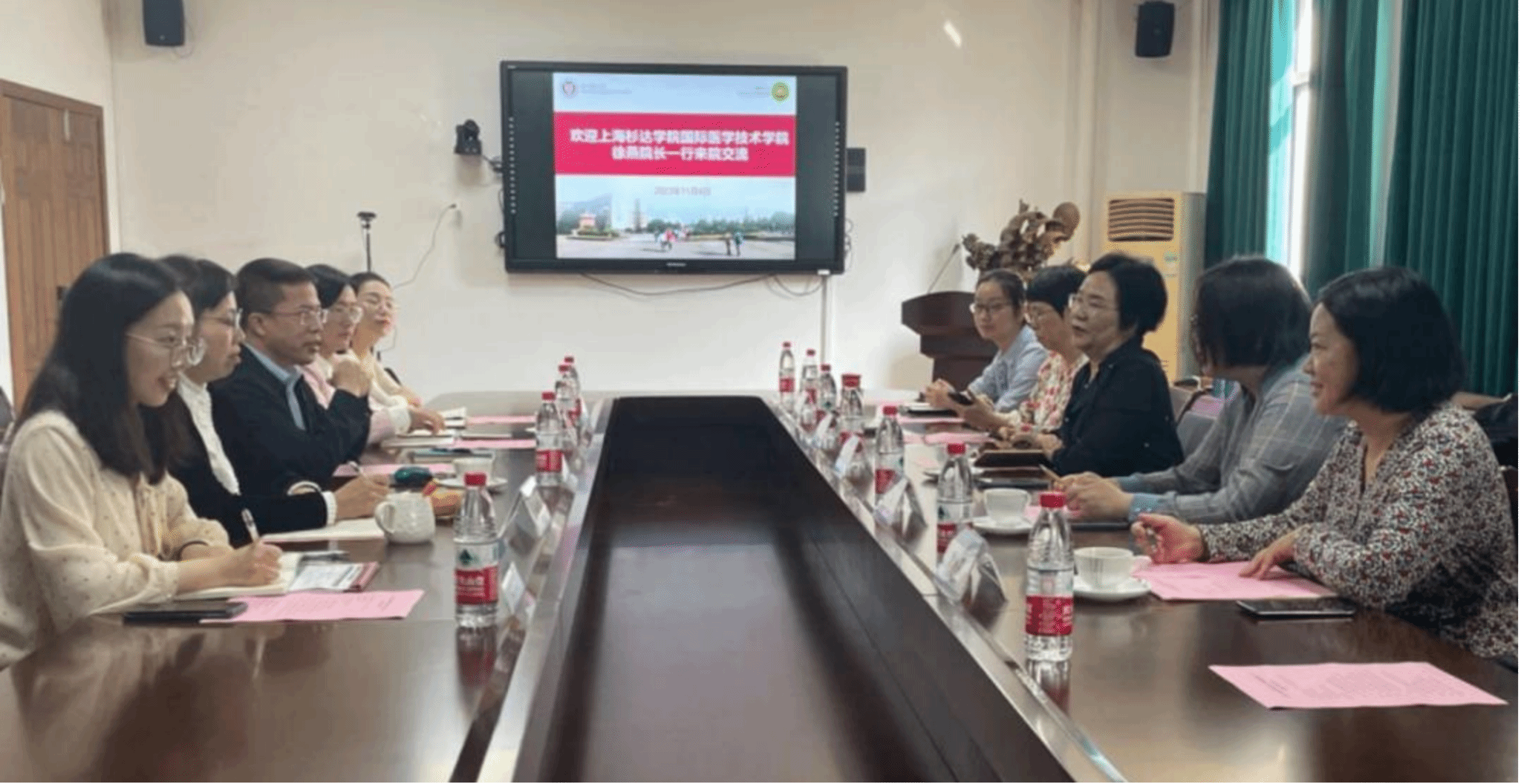 11月6日,上海杉达学院国际医学技术学院院长徐燕、党总支书记丁俭、 副院长张静、护理系主任岳立萍、护理系副主任胡菁来院访问交流。我院院长蔡福满、党委副书记陈素云、教学办主任孙海琴、外科教研室副主任江思思等在学院会议室热情接待了客人。