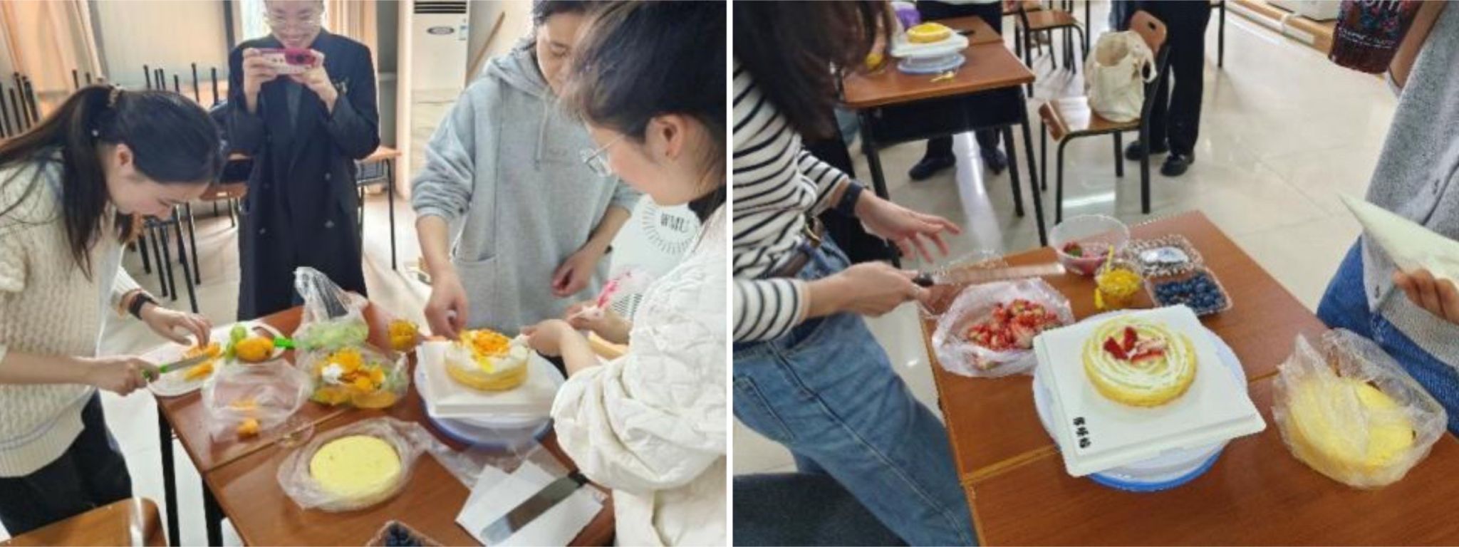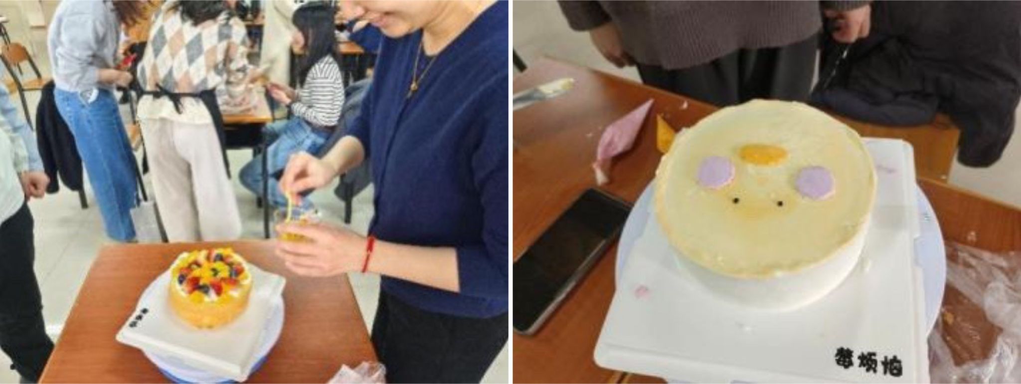 活动开始前,学院研究生会为同学们准备了丰富的蛋糕制作原料,如蛋糕胚、奶油、水果等。在简单介绍蛋糕DIY活动流程后,大家纷纷动手开始制作。活动中,同学们充分展示自己的才能,以独特的设计理念和风格,制作出了精美的蛋糕作品。一些蛋糕上点缀着美丽的鲜花和糖霜,而另外一些则以简洁流畅的线条进行装饰,每位同学的作品都充满了个性和想象力。