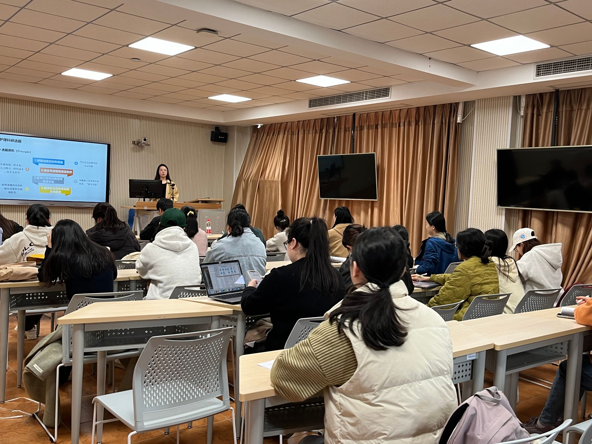唐涵就“护理硕士科研方法及常见问题解析”作主题演讲。她首先详细介绍了科研选题的原则与方法;其次,阐述了一些不同研究设计过程中容易出现的问题,以及研究设计环节中需要注意的各项细节;然后,以自己的课题为例,分层剖析如何紧贴研究主题开展写作;最后,分享了自己的科研心得体会,鼓励每一位护理科研人正确看待困难,不畏艰难,勇往直前。唐博士以“过来人”的身份,讲述科研基础知识和自己的科研经历,深入浅出,娓娓道来,从理论到实践,为与会师生提供了宝贵的经验和建议。