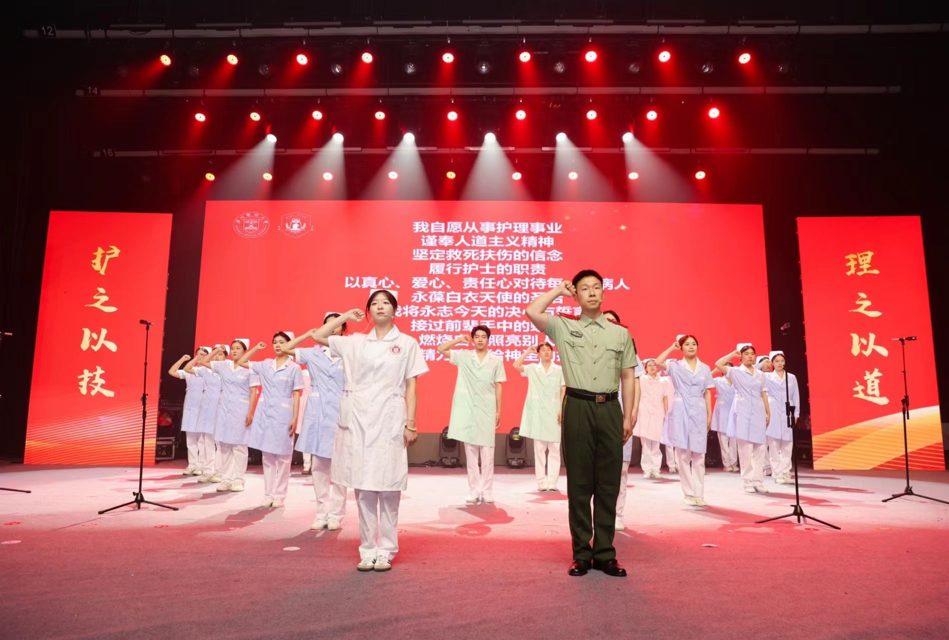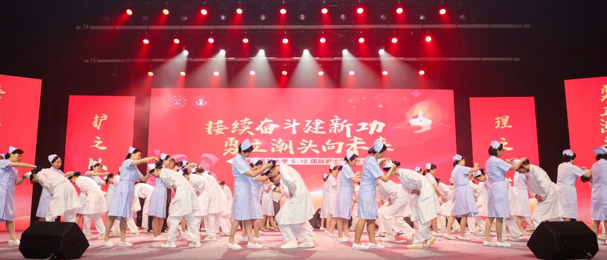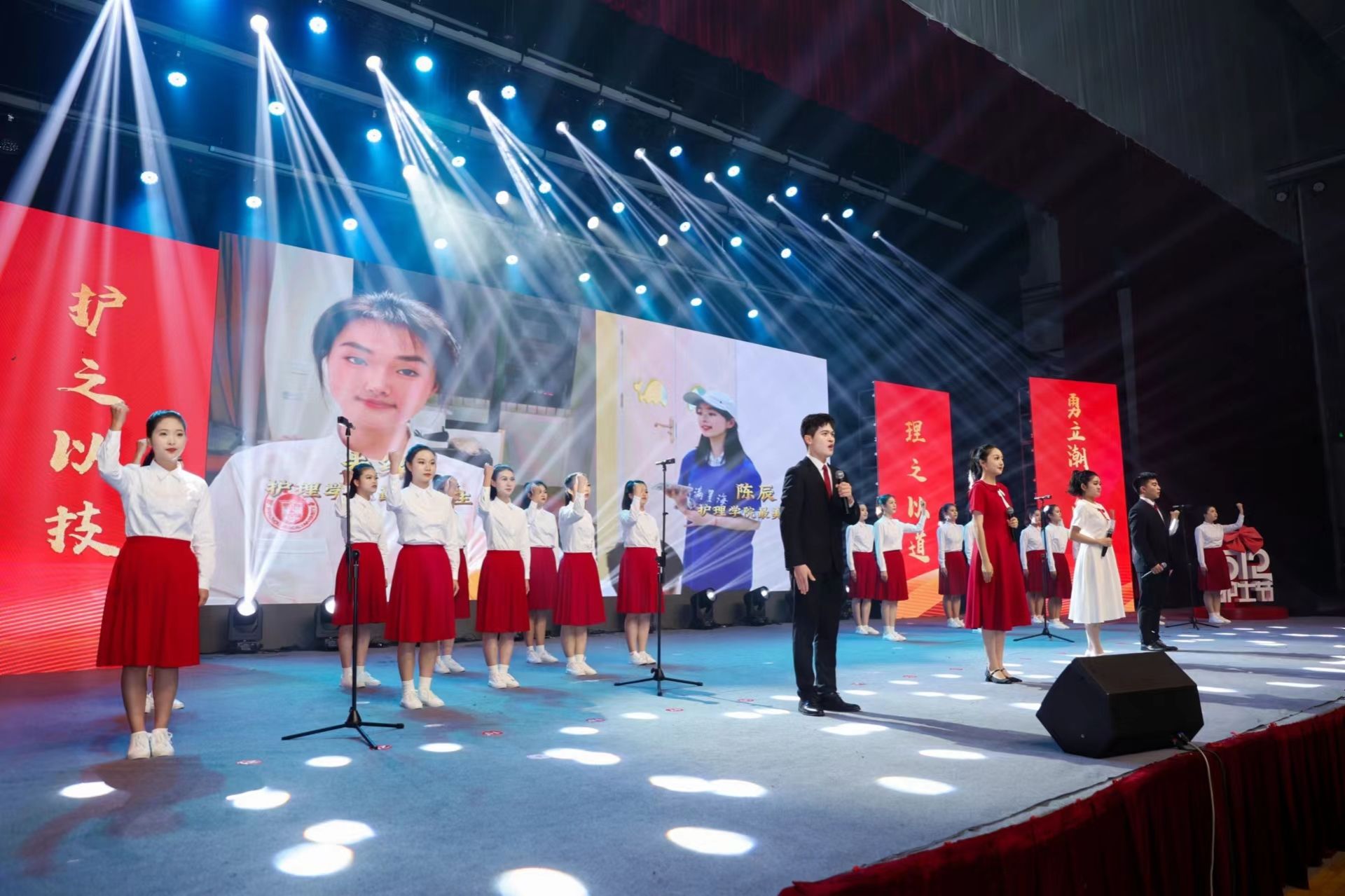 筑梦之途,光辉灿烂。活动现场,护理学子以激情澎湃的朗诵、歌唱与舞蹈,展示着当代青年的生机与自信。学校附属第一医院和第二医院的护士们用舞蹈表演、独唱等形式表达着自己对护理事业的热忱及对后辈们的殷切希望。作为新时代的护理人才,他们不仅向众人展现了护理青年的自信心与多元发展的风采,还彰显了护理人代代相承的情怀与英姿。