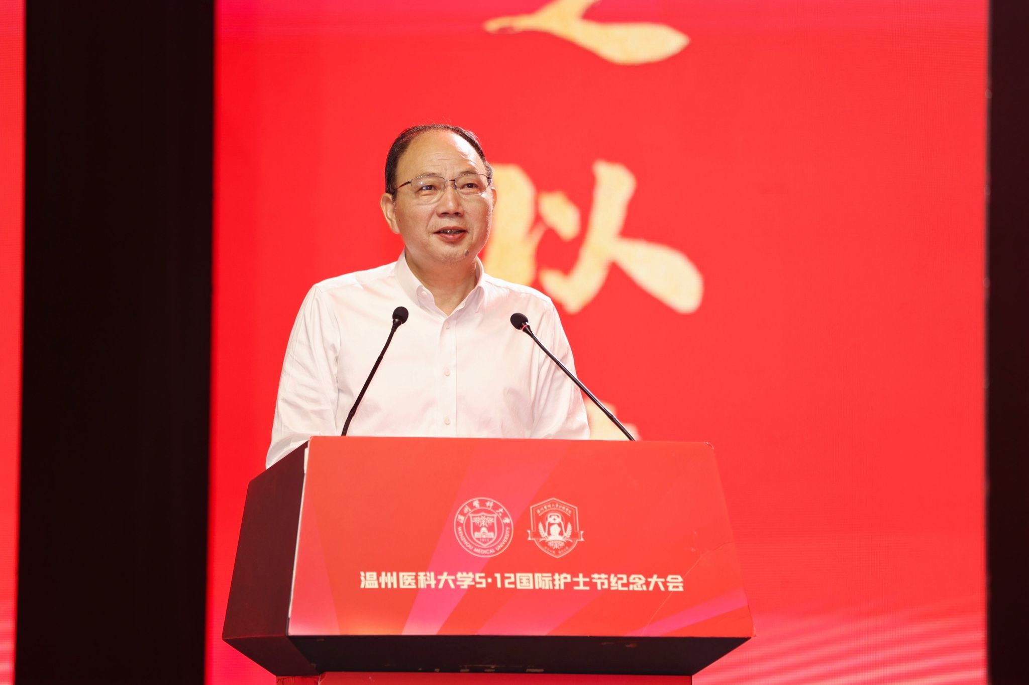 活动在庄严的国歌演奏中拉开帷幕。吕一军向温医大护理工作者致以诚挚的问候和崇高的敬意,向全体护生表达美好的祝福。他指出,护理工作平凡而伟大,全校护理工作者秉承南丁格尔精神,用实际行动践行使命担当。面对当前护理工作带来的机遇和挑战,他勉励护理学子们要坚守初心,精耕细作,不断提高自身的职业道德素养和专业技能水平,做到心中有理想、眼中有光芒、肩上有担当;要坚守耐心,精诚所至,贴近患者、临床和社会,用仁心播散大爱、用耐心捍卫健康,用温暖温情温馨构建美好健康未来;要坚守恒心,精金百炼,发扬创新和钻研精神,加强学习与研究,为探索全生命周期护理服务未来之路不懈奋斗。