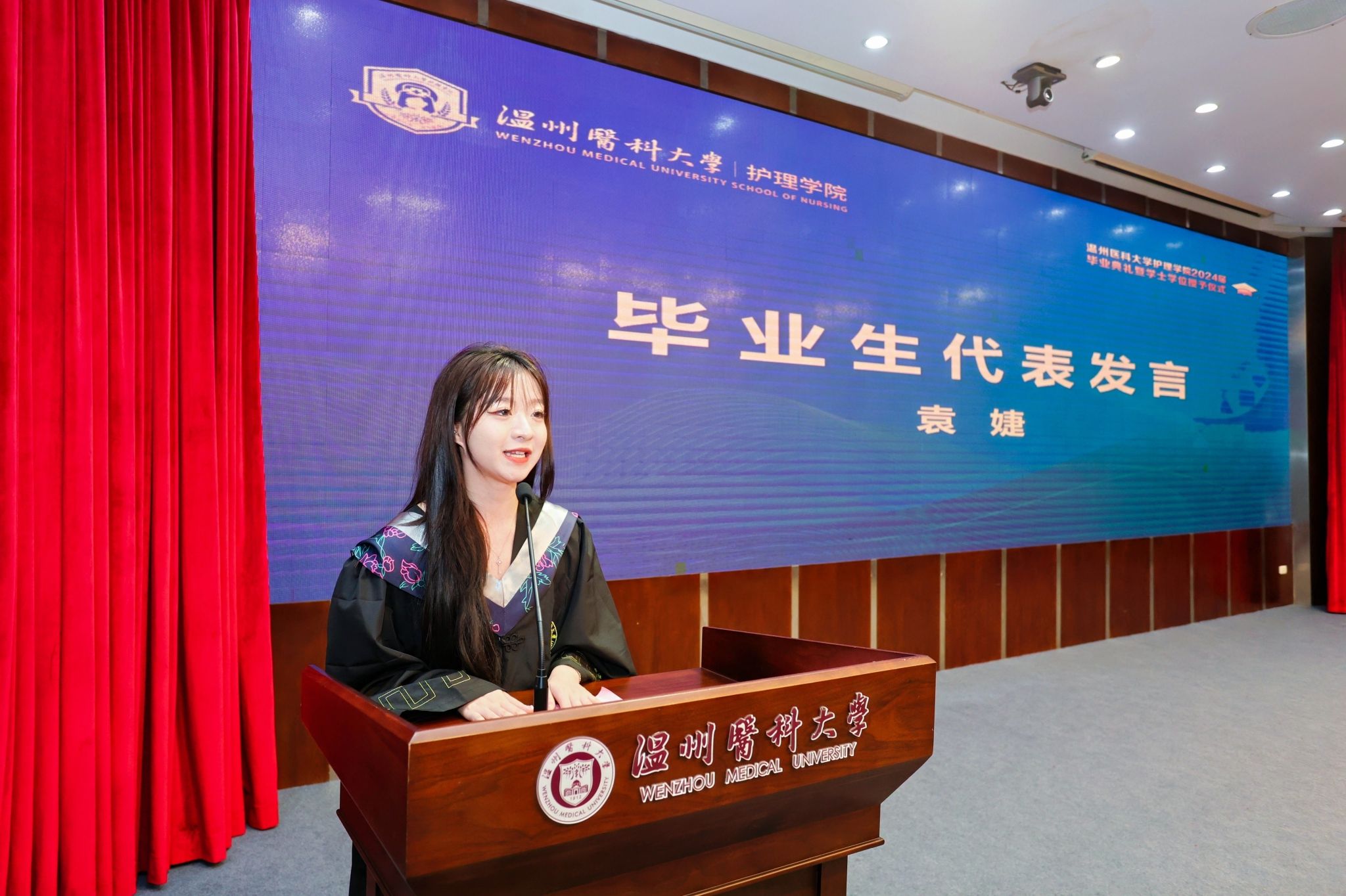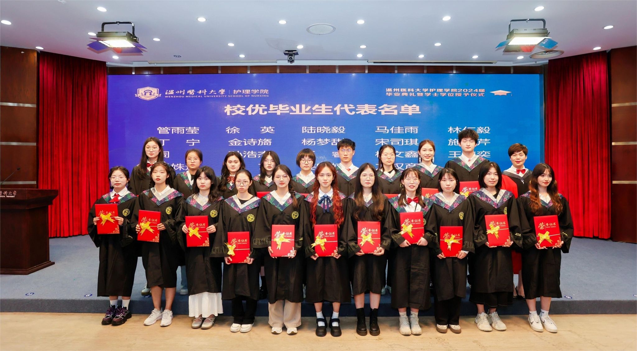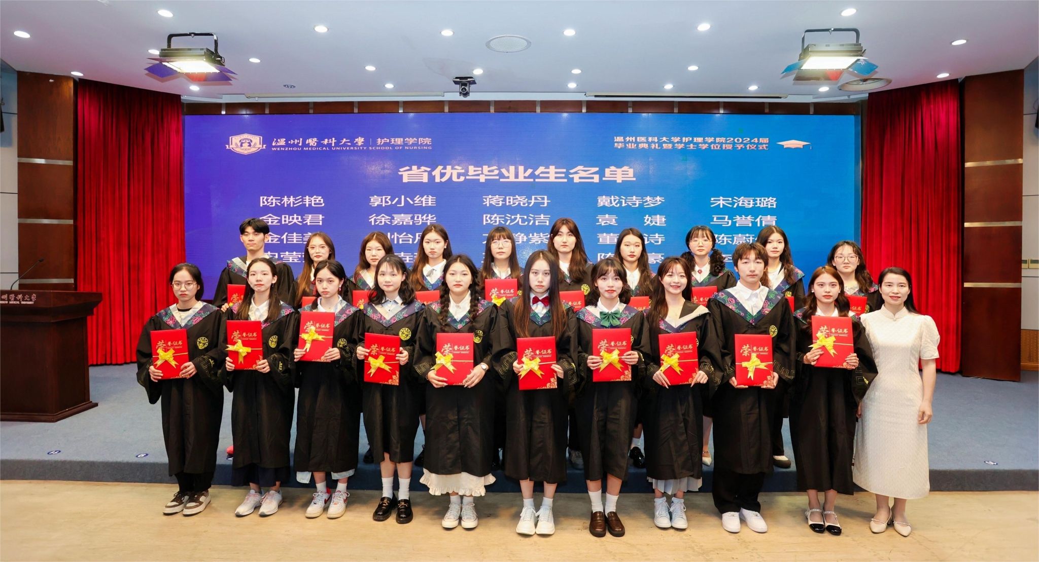 2024届本专科毕业生中有20位学子获浙江省优秀毕业生称号,85位学子获温州医科大学优秀毕业生称号,35位同学成功考取研究生。其中20护本7班蒋泽凯同学成功考取浙江大学护理学专业研究生;20护本6班袁婕同学荣获校“十佳大学生”荣誉称号,同时她也在第十八届“挑战杯”全国大学生课外学术科技作品竞赛获一等奖;21护专金雨欣同学在全国大学生田径锦标赛女子铅球项目中取得第八名好成绩,刷新我校田径历史;20护本1班团支部成功入选浙江省高校“活力团支部”,多位毕业生在核心期刊及以上杂志发表论文或在各类创新创业大赛中获得佳绩。