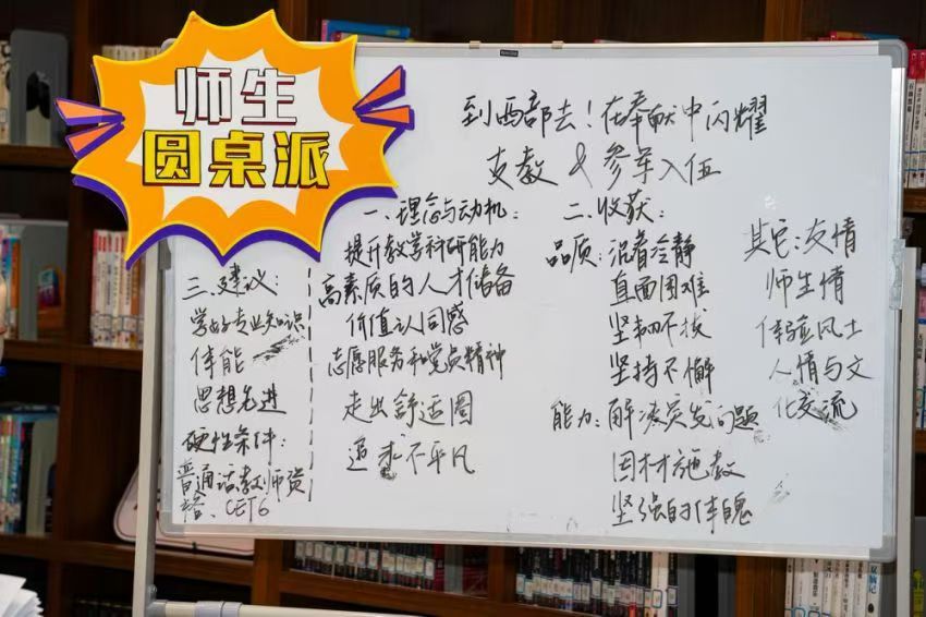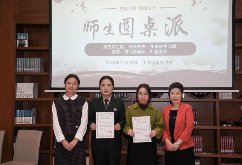 第五期师生圆桌派于11月18日下午在图书馆青春书房成功举办,本次活动以“到西部去!在奉献中闪耀”为主题,通过师生分享支援西部经历,共同探讨宝贵经验,更好奉献社会。本次活动嘉宾为威廉希尔体育符丽燕老师、叶星老师,肖芳同学、陈嘉泓同学,现场观众由学生党员、入党积极分子代表及线上2024级大一新生组成。