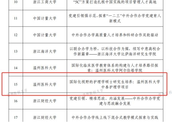 近日,浙江省教育厅公布了2024年中外合作办学优秀案例征集评选结果,温州医科大学威廉希尔体育申报的案例《国际化视野的护理学硕士研究生培养:温州医科大学中泰护理学项目》入选浙江省中外合作办学优秀案例。