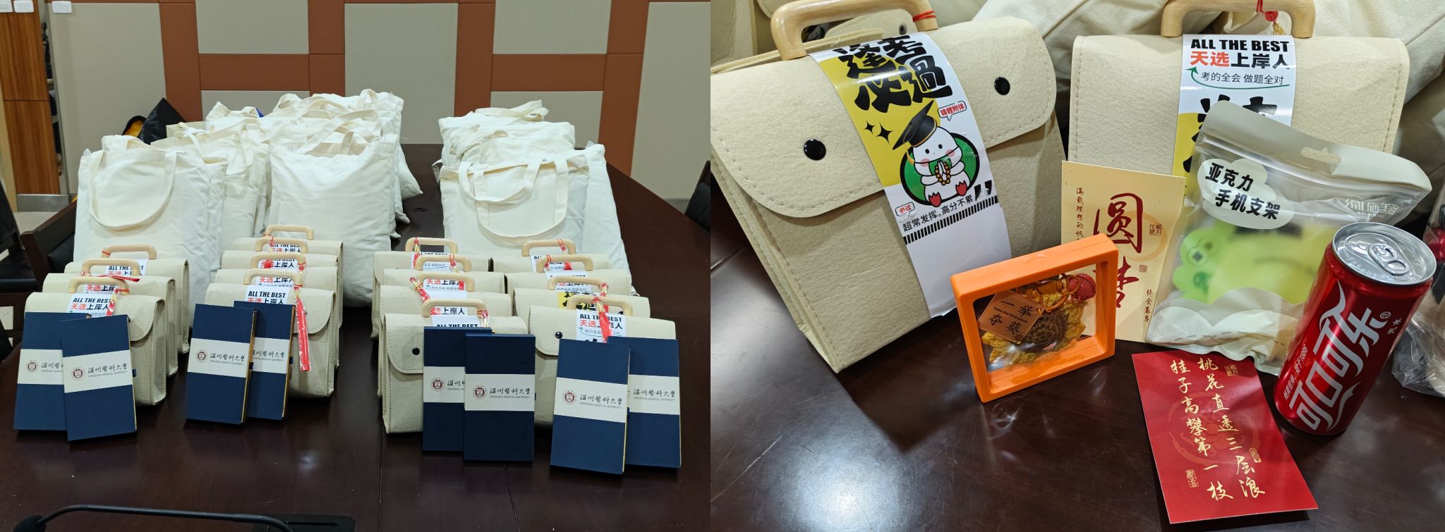 在考研冲刺的关键阶段,为深入了解我院考研学子的备考情况,送上学院的温暖关怀。近日,威廉希尔体育2025届辅导员张迪、李飞跃和张颖走访了温州市区实习点,为实习期间努力备考的同学们送去了精心准备的考研大礼包,每一件礼品都蕴含着美好寓意。象征着“一举夺魁”的针织葵花,愿同学们在考研的战场上勇夺佳绩。象征着“青松上岸”的手机支架,希望能够缓解同学们备考时的疲惫,保持最佳状态。同时,贺卡上写满了考研祝福语,愿同学们在考研的路上,每一步都坚定而有力...