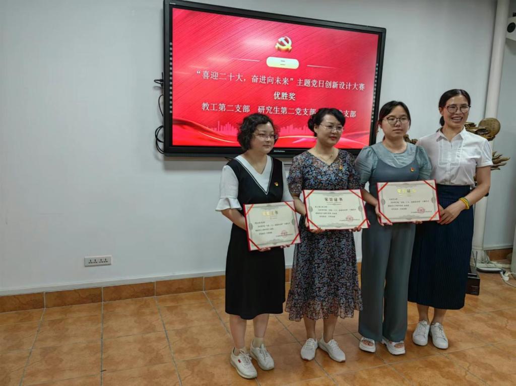 现场举行了“喜迎二十大,奋进向未来”主题党日创新设计大赛颁奖仪式,由张春梅副院长为优秀党支部进行颁奖。