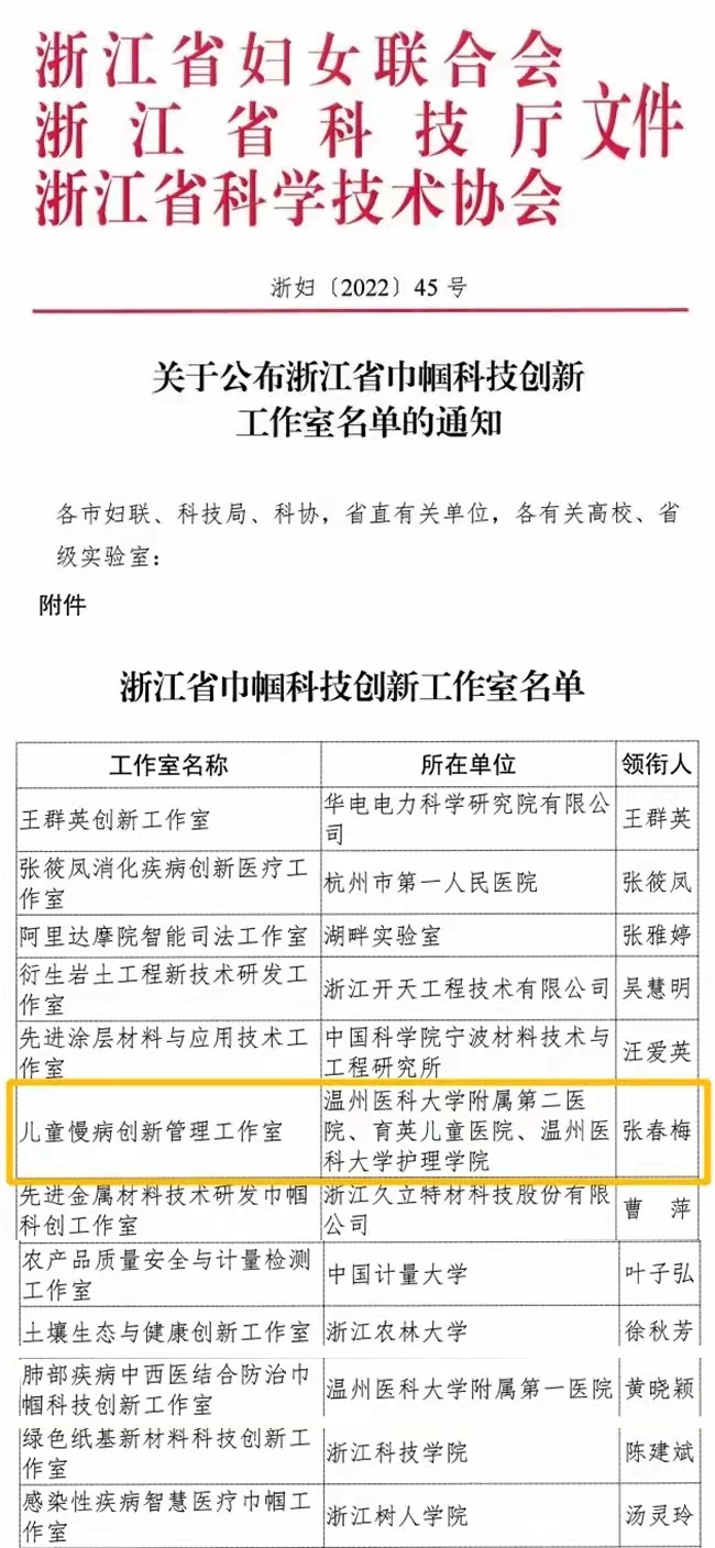 为深入贯彻落实浙江省第十五次党代会和全省科技创新大会精神,持续深化科技创新巾帼行动,推进女性科技人才为奋力推进“两个先行”贡献巾帼力量,近日,省妇联、省科技厅、省科协联合发文公布了“浙江省巾帼科技创新工作室”评选结果,我院张春梅副院长的“儿童慢病创新管理工作室”榜上有名,可喜可贺!