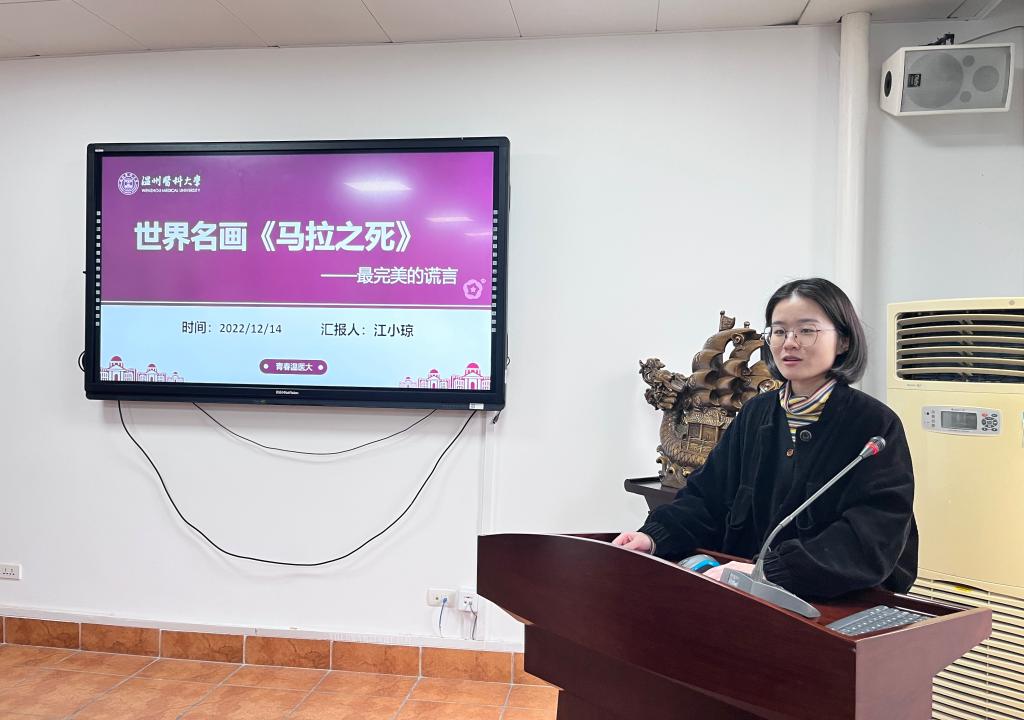 江小琼老师带我们一起赏析世界名画《马拉之死》,让我们了解了该画的创作背景,并且带我们了解了藏在这幅画背后的三个谎言,整个画面平静、庄重,着意刻画马拉之死的崇高和宁静。但事实却是却将一名暴君描绘成了悲悯的圣人,掩盖了真相。并由艺术也会撒谎提醒我们教师要严守科研诚信规范。