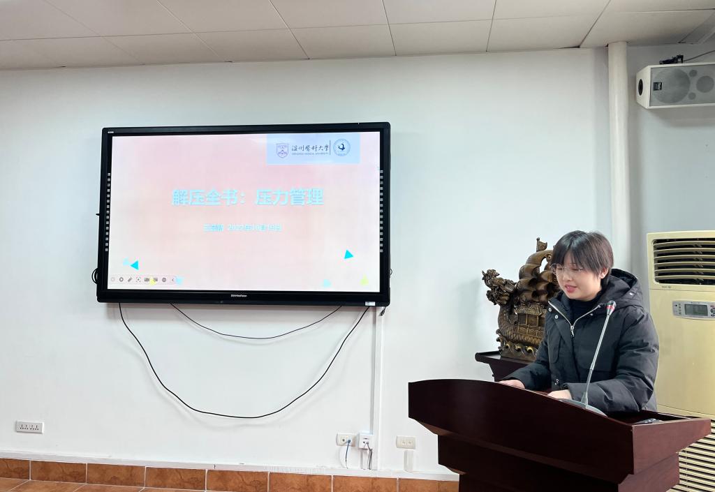 王茹新老师和我们分享了美国当代著名压力管理专家伊夫·阿达姆松的作品《解压全书:压力管理》,她从书籍介绍、压力揭秘、压力对身心的影响、压力管理方法四个方面介绍。并结合自己的生活经验,分享了她进行压力管理的办法。