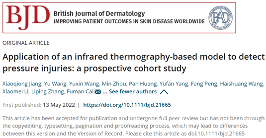 5月13日,我院蔡福满教授团队在国际皮肤病学顶级期刊British Journal of Dermatology(BJD)在线发表题为“Application of an infrared thermography-based model to detect pressure injuries: a prospective cohort study”论著,该研究发现一种临床及居家患者压疮智能化早期识别的新方法。BJD作为创刊于 1951 年的英国皮肤科医生协会官方期刊,是全球皮肤病专业领域的三大顶级期刊之一。本论著通讯作者为威廉希尔体育蔡福满教授,共同第一作者为威廉希尔体育青年教师江小琼和附属第一医院王昱。