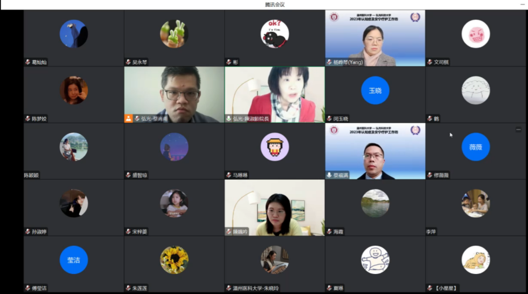 为加强师生对认知症及安宁疗护的理解,继续推进我院老年健康服务的人才培养和学科发展,在学校国际合作交流处的指导下,我院于2月17-19日特别邀请台湾弘光科技大学护理系邱郁雯和陈佩吟老师开展“认知症及安宁疗护工作坊”线上专题学术交流会。弘光科技大学护理系院长陈淑龄作开幕式致辞,我院院长蔡福满致欢迎辞,我院分管国际合作交流工作副院长杨晔琴、学院教师、附属医院临床指导老师及研究生共55人参加了此次工作坊。