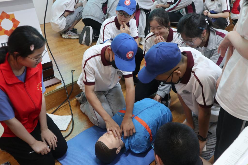第三站,同学们来到了向阳工坊,参加“生命守护”急救培训。姜文莉老师为同学们进行心肺复苏的讲解以及演示。在此过程中,同学们认真听讲,并利用人体模型进行实操练习。培训结束后,同学们都能够基本掌握相关的急救知识,一位同学跟志愿者说到:“原本以为这只是医生护士会做的事,我能够学到这个知识很开心,希望能在日后的生活中帮助到身边的人!”