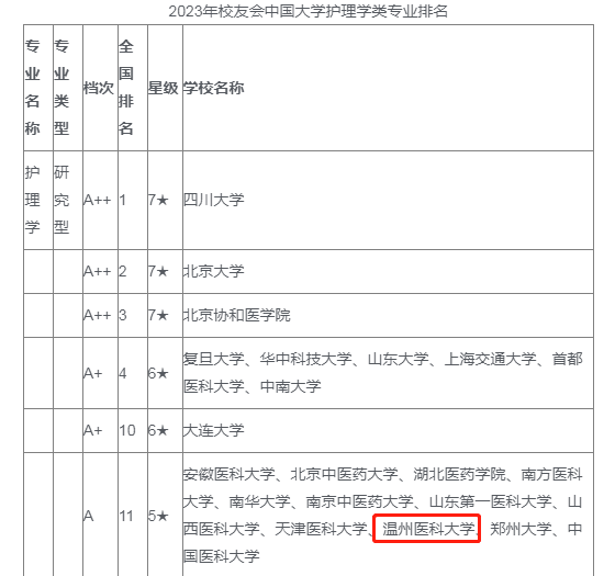 校友会中国大学一流专业排名是目前中国参评高校数量最多和参评专业规模最大的中国大学本科专业排名。该评价指标由学科水平、培养质量、师资水平、专业水平和专业影响等5大指标构成。在2023中国大学一流专业分档排名中,我院护理学专业获评2023中国五星级专业(5★),专业档次A,位列护理学专业(研究型)排行榜并列第11位,进入世界知名专业、中国一流专业行列。助产学专业获评2023中国三星级专业(3★),专业档次A+,位列助产学专业(研究型)排行榜并列第3位,跻身中国区域一流专业行列。