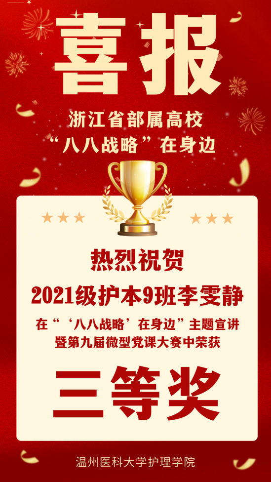 今年是“八八战略”实施20周年。为进一步学习宣传“八八战略”的丰富内涵和时代价值,6月30日,浙江省部属高校“‘八八战略’在身边”主题宣讲暨第九届微型党课大赛在浙江传媒学院举行。在该比赛中,我院2021级护本9班李雯静同学以《翻“山”越岭的竹笋》荣获“三等奖”!