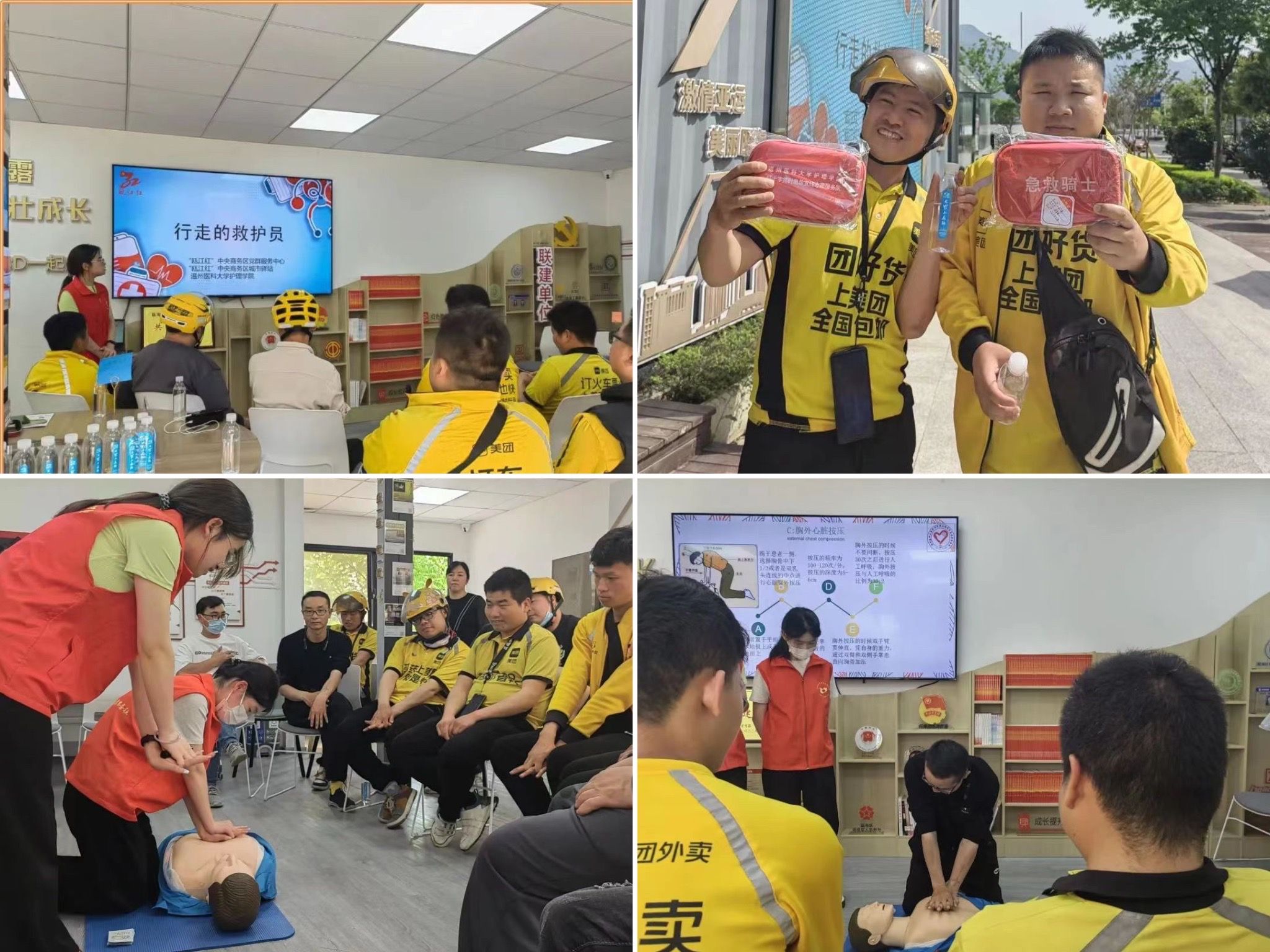 “急救骑士”项目,是我院服务队积极与温州市红十字会和瓯江红党群服务中心进行合作,针对外卖员匆忙进食易导致呼吸道梗阻的现象,以及外卖员接触人群大的特点,通过所学的护理学专业知识和技能,对外卖小哥进行心肺复苏、海姆立克等急救知识的科普和教学活动,目的是为了提高骑士们的急救意识,努力培养一批流动的急救人员。