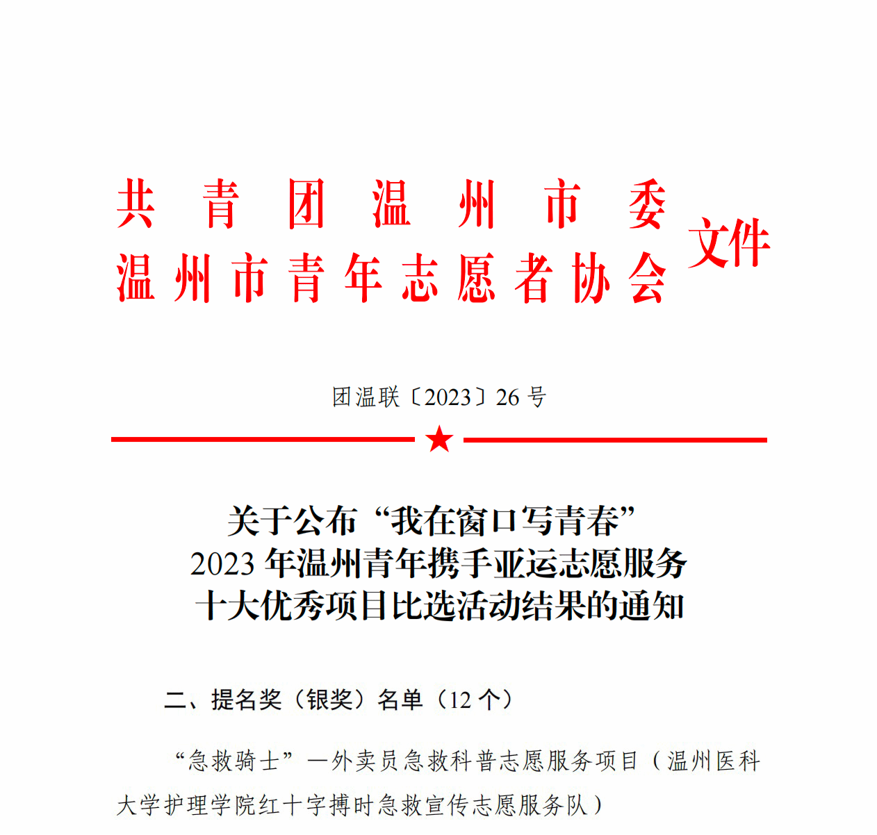 7月11日,我院白鸽青年志愿者服务社申报的“急救骑士”——外卖员急救科普志愿服务项目在由温州团市委、市青年志愿者协会举办的“我在窗口写青春”2023年温州青年携手亚运志愿服务十大优秀项目比选活动中喜获银奖。