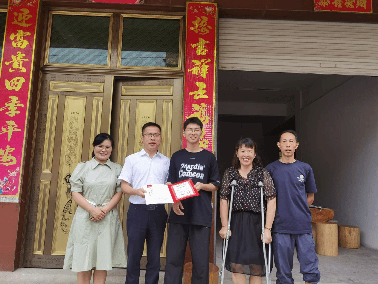 7月29日上午,威廉希尔体育院长蔡福满前往丽水市莲都区,化身“邮差”亲自将2023年第一份录取通知书送到学生舒斌凯手中,学院社区教研室主任李菊芳陪同。